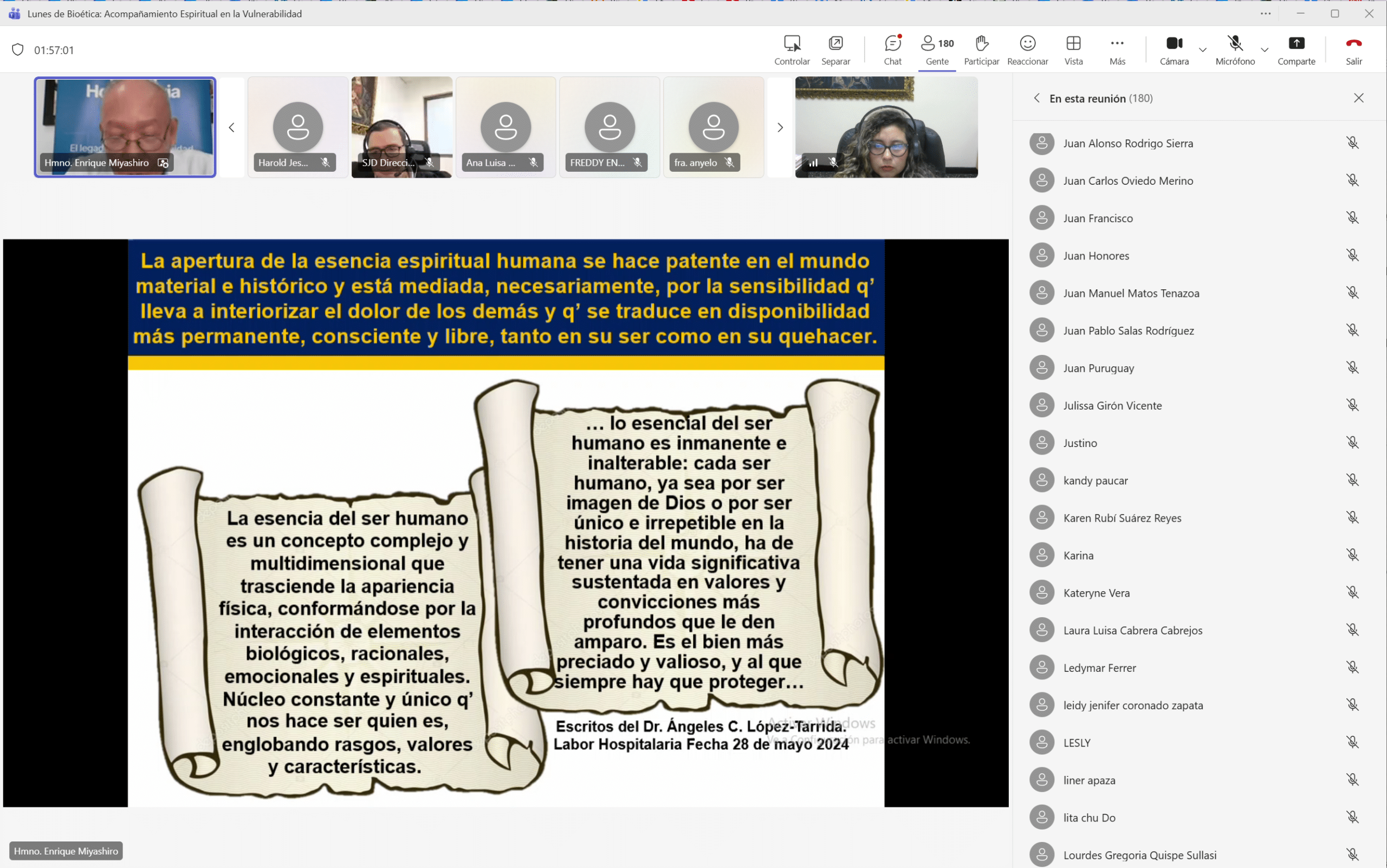 La conferencia estuvo dirigida por el Hno. Enrique Miyashiro, OH., médico cirujano formado en la Universidad Nacional Mayor de San Marcos, destacando su valiosa trayectoria y aporte dentro de la Orden Hospitalaria, especialmente en el ámbito de la salud mental, la bioética y el acompañamiento espiritual. Durante su intervención, ofreció una reflexión profunda sobre el sentido de la bioética desde la hospitalidad, abordándola no solo como un conjunto de principios, sino como una vivencia concreta en el encuentro con el otro. Enfatizó la necesidad de un acompañamiento integral que contemple no solo la dimensión física, sino también la emocional, social y espiritual de la persona, especialmente en contextos de vulnerabilidad, sufrimiento o fragilidad. Asimismo, invitó a los participantes a reconocer el valor del cuidado humanizado, donde la escucha activa, la empatía y la compasión se convierten en herramientas esenciales del quehacer sanitario. Sus palabras, cargadas de experiencia y humanidad, pusieron una vez más en el centro a la persona asistida como eje del quehacer sanitario, recordando que cada encuentro con el paciente es también una oportunidad para ejercer la hospitalidad con sentido, respeto y profunda dignidad.