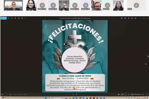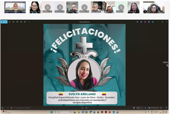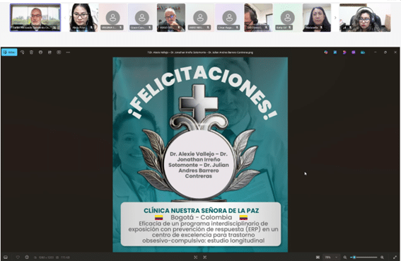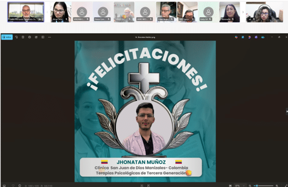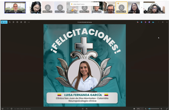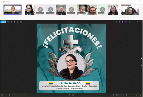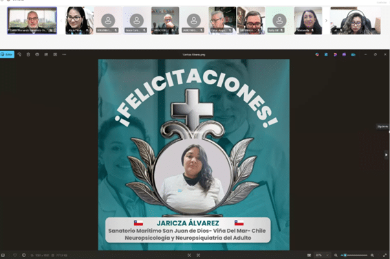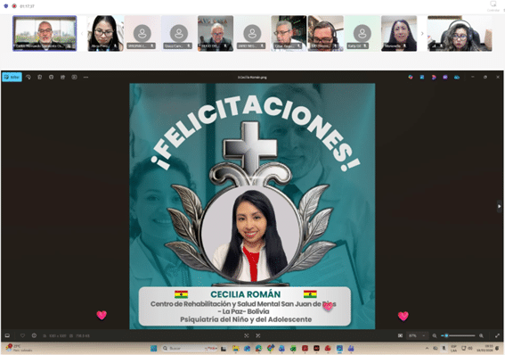 Como parte del cierre, se compartió el testimonio en video de la Dra. Ximena Ordóñez, Psiquiatra del Hospital San Rafael de Pasto (Colombia) y becaria de formación 2024 en la especialización en Adicciones, quien expresó su gratitud por esta oportunidad, destacando el impacto positivo en su desarrollo profesional y en la atención a sus pacientes. Asimismo, Karla Bravo, ganadora de la beca de investigación 2024, presentó
